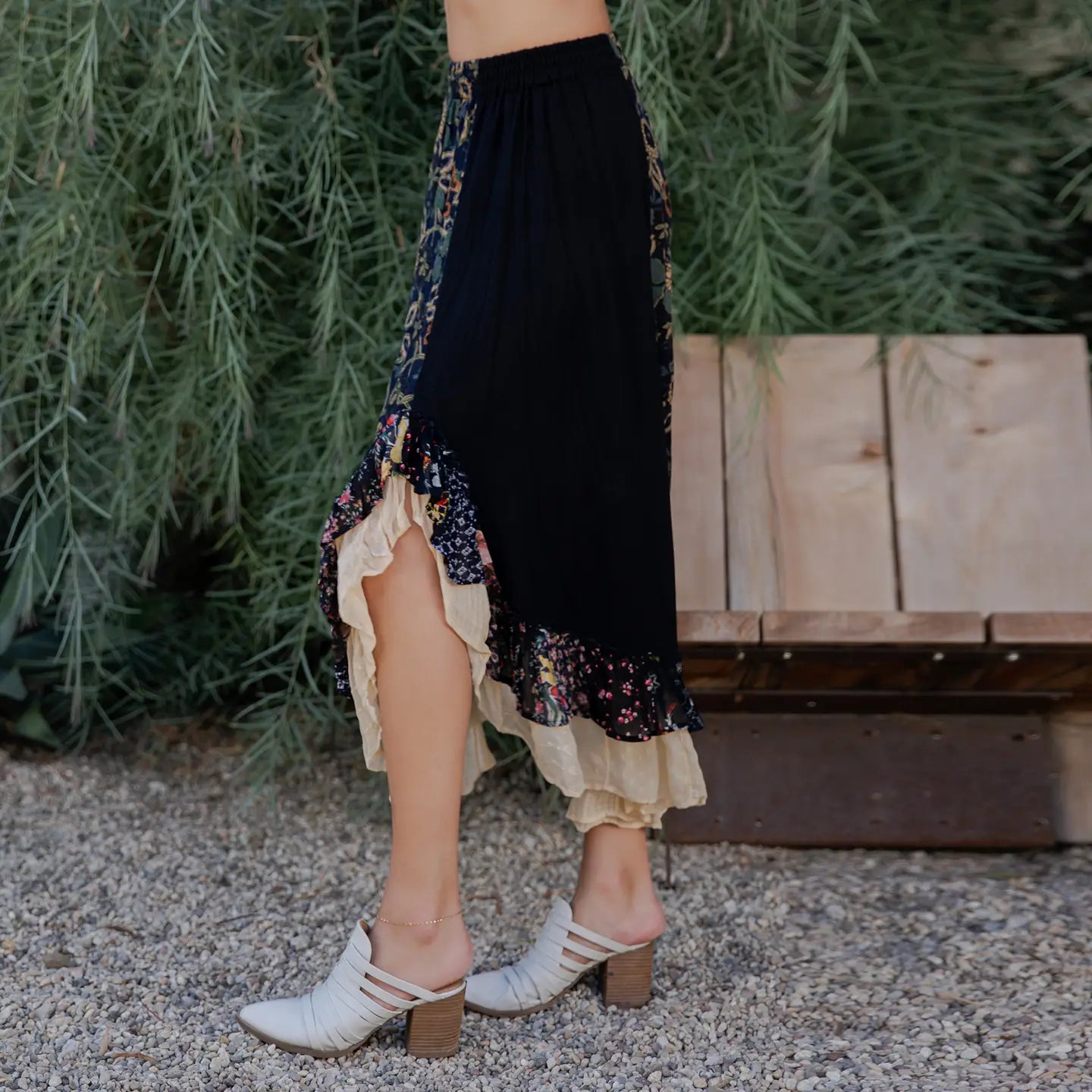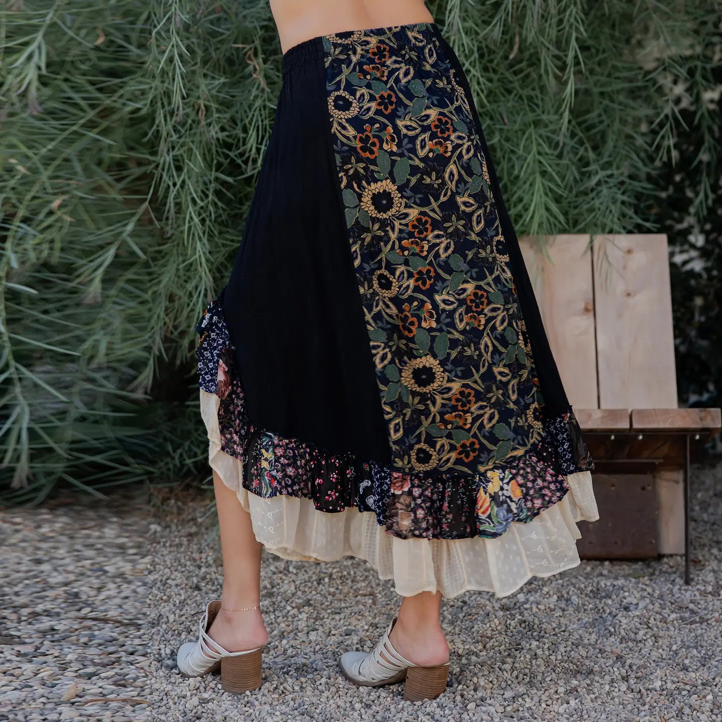 What's not to love about this whimsical overdyed bohemian skirt with a country flair? Asymmetrical panel construction and flirty yet modest ruffles gathered at the knee make this skirt easy to pair with with flats, heels or your favorite pair of boots. The elastic waistband and black side panels make this style both comfortable and flattering on any figure. Fabric is a mix of acrylic, rayon and viscose.