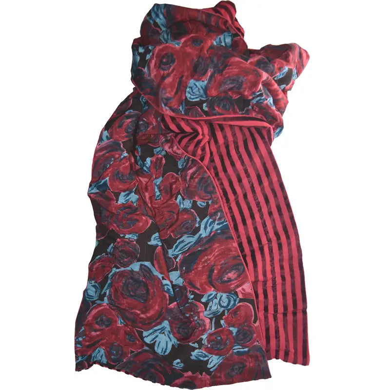 Soft velvet stripes on one side and viscose florals on the the other. Slightly rusched gathers. 100% Cotton Velvet and Viscose, 66.5" x 9.5". Made in India.
