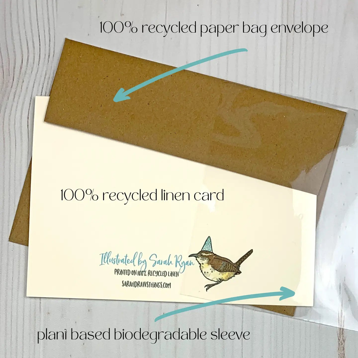 This gorgeous 5x7" notecard is printed with archival inks on recycled linen paper. The notecard is a soft white color with crosshatched texture. Each card comes with a 100% recycled brown bag envelope. Packaged in a plant-based sleeve.