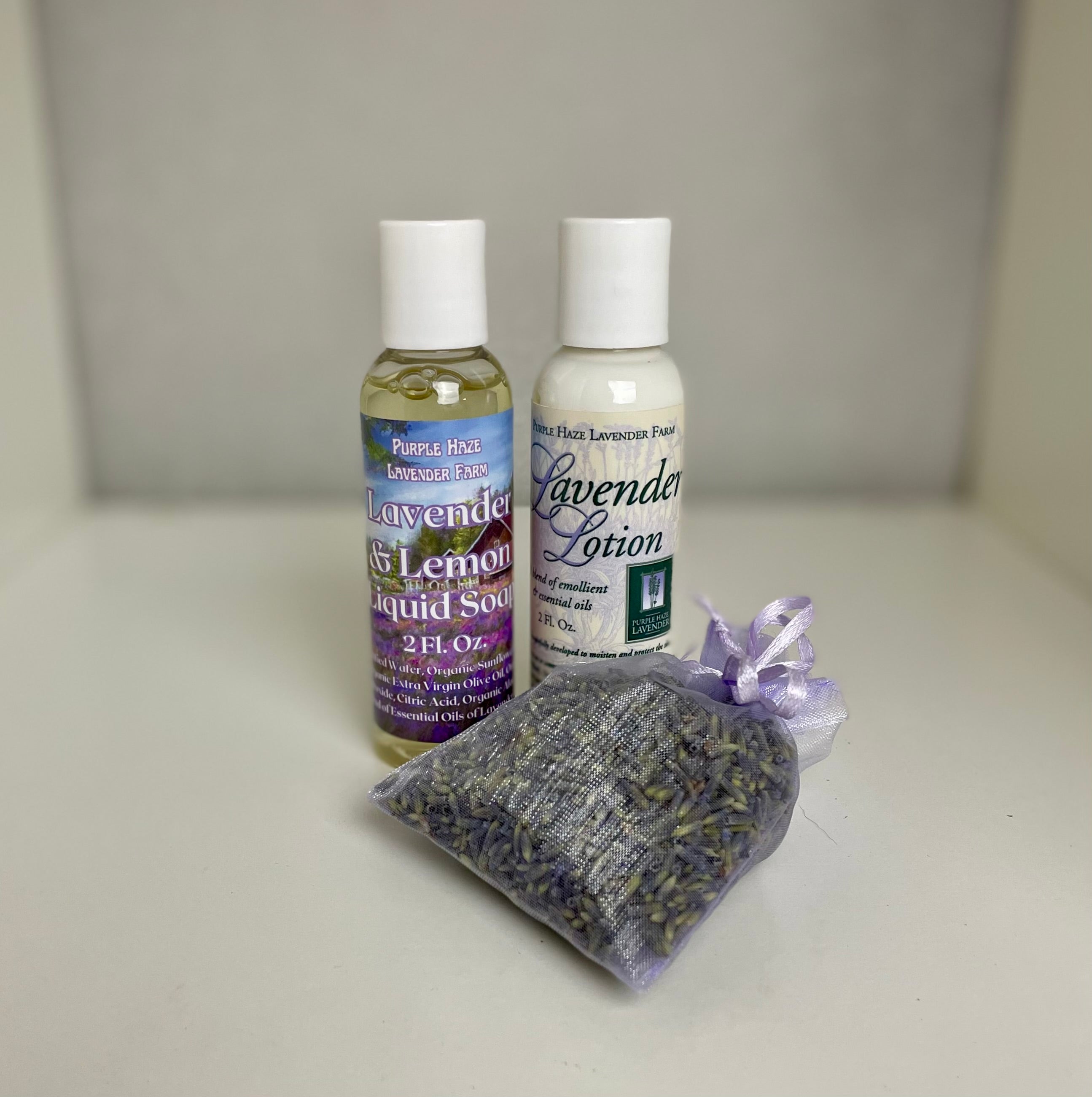 Perfect for the purse or backpack, this set includes one 2 oz lemon lavender liquid soap, one 2 oz lavender lotion and one small sachet. Comes wrapped in cute white box with organza ribbon and lavender spring.